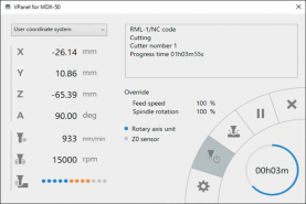 集成于設(shè)備單元前端的控制版面幾乎可以控制所有操作,用戶無(wú)需往返于電腦與設(shè)備之間。VPanel界面可與MDX-50無(wú)縫對(duì)接,方便用戶調(diào)整主軸轉(zhuǎn)速和速率。